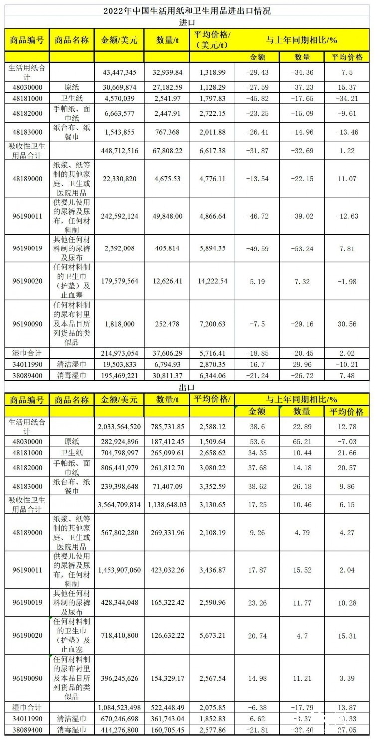 2022年中国生活用纸和卫生用品进出口情况
